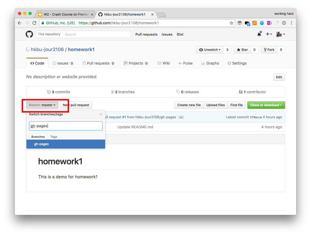 Go to repo "homework 1", click "Branch" button, type in "gh-pages" and create this branch.