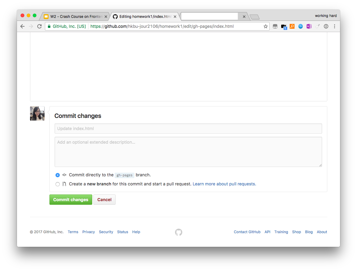 If you would like to commit the changes to save your HTML file, please make sure you are directly committing to "gh-pages" branch.